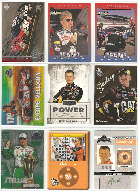 NASCAR driver. A few years ago my wife was into NASCAR. Not so much these days. Her favorite driver at the time was Jeff Burton. Somehow I thought if I collected him she'd appreciate my other collections a bit more. She still likes JB, but the collection didn't help so much on my other projects. I think that racing cards have more funky die-cut cards than baseball. Checklist.